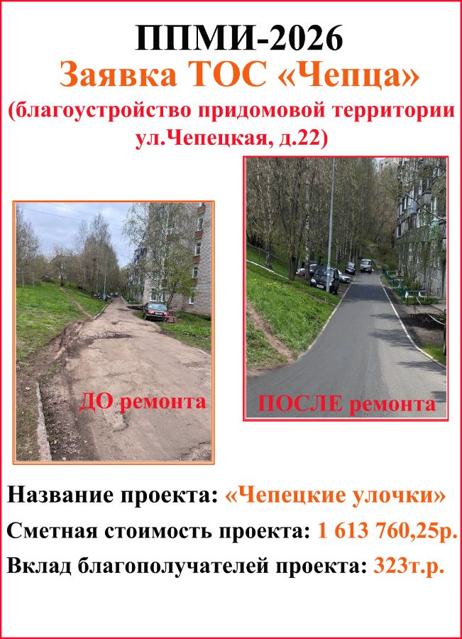 В этом году ТОС "Чепца" (ул.Чепецкая, д.22) участвует в конкурсе с проектом по благоустройству придомовой территории "Чепецкие улочки" (асфальтирование внутридворового проезда). Сметная стоимость проекта составляет 1613т.р., из которых 323т.р. - вклад населения. Реализация проекта состоится летом 2026 года.